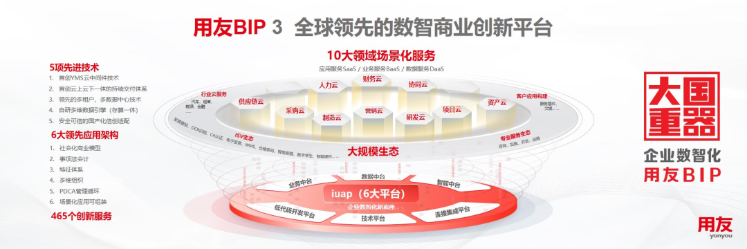 面對難得的市場和產(chǎn)業(yè)發(fā)展機遇,用友經(jīng)過6年的規(guī)模研發(fā)、持續(xù)迭代,以全新理念、全新技術(shù)、全新架構(gòu)、全新模式打造了面向企業(yè)和公共組織數(shù)智化的全新一代產(chǎn)品——用友BIP,并在平臺技術(shù)、應(yīng)用架構(gòu)、創(chuàng)新服務(wù)等方面實現(xiàn)多項重大突破與升級,達到全球水平,包括5項技術(shù)、6大應(yīng)用架構(gòu)、465項創(chuàng)新服務(wù),覆蓋智能財務(wù)、數(shù)智人力、數(shù)智采購、數(shù)智營銷、智能制造、數(shù)智供應(yīng)鏈、數(shù)智研發(fā)、數(shù)智項目、數(shù)智資產(chǎn)及協(xié)同工作等十大核心領(lǐng)域,是目前全球領(lǐng)域覆蓋較多的企業(yè)云服務(wù)群。